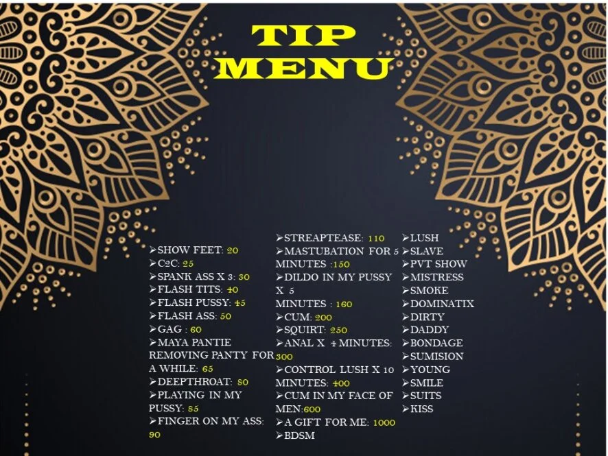 Sexlegetøj, Blowjob, Anallegetøj, Creampie, Deepthroat, Rygning, Onani, Dildo eller vibrator, Dirty talk, Orgasme, Topløs, Fodfetich, Ahegao, Kameltå, Cumshot, Blottelse, Ydmygelse, Onaniinstruktion, Rollespil, Striptease, Hæle, Cowgirl, Spanking, Erotisk dans, Finger, Brystvortelegetøj, Brystsex, Knebling, Sprøjt, Røv til mund, Hardcore, Fisting, Bedømmelse af pik